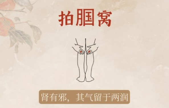 方法:双手掌心相对,轻拍膝盖后侧,至微微发热。有助于补肾强腰,缓解腰腿疼痛。