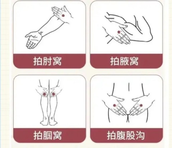 遵循“先上焦后下焦”的原则,即从双腋窝开始,依次是双肘窝、双髀窝和双腘窝。